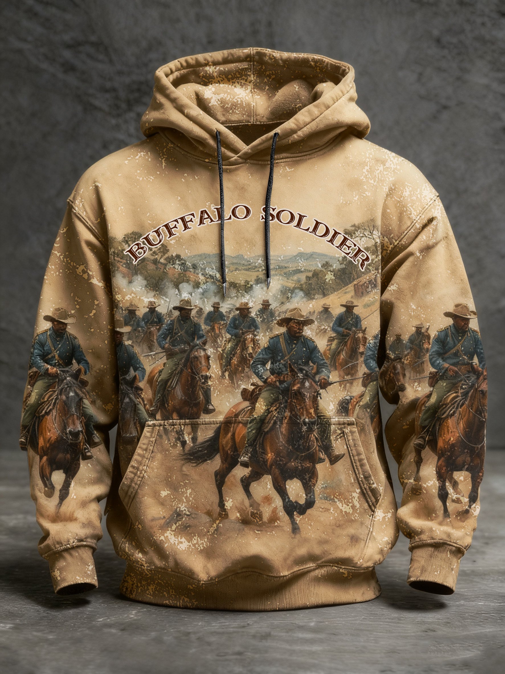 Men's Western Retro Buffalo Cavalry Print Crew Neck Hooded Sweatshirt