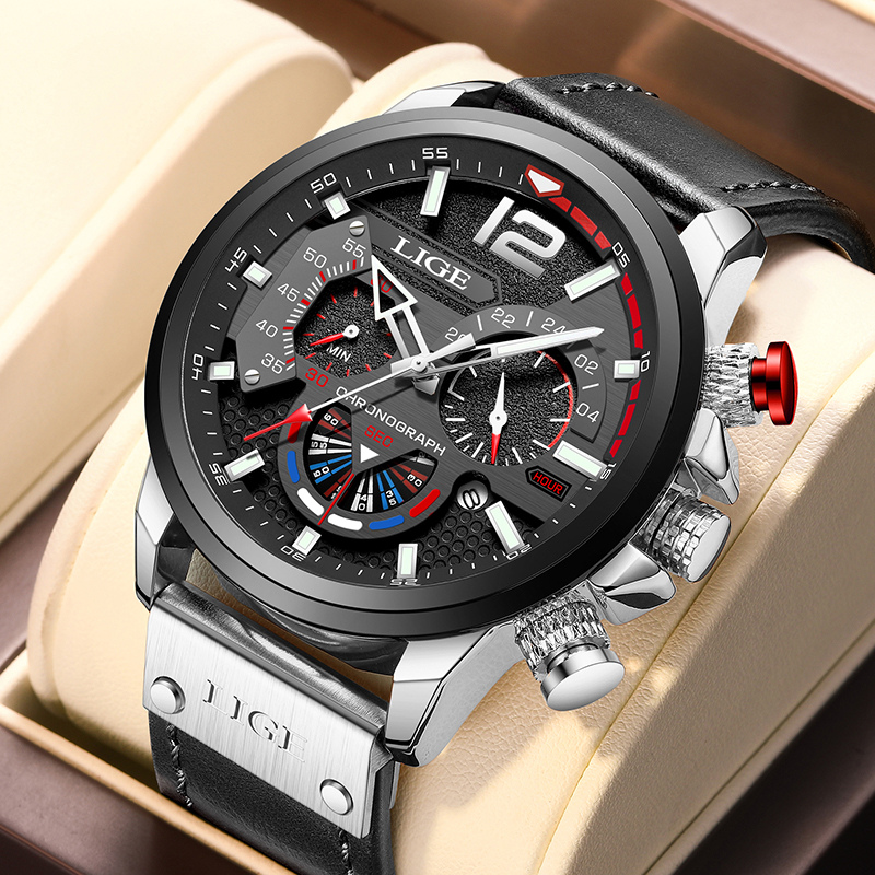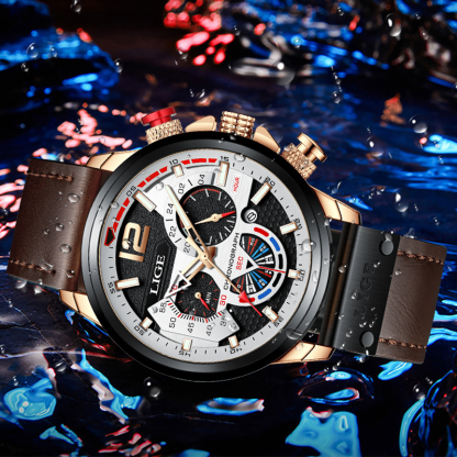 Vanguard Pro is the perfect watch for the man who knows no limits – and will not accept any loss of comfort on a tough adventure. With a precise quartz movement, a striking chronograph display, and a date indication, this watch is as robust as it is stylish. The high-quality leather strap not only guarantees comfort but also gives your wrist an elegant aura, while the water-resistant design ensures that this watch remains reliable under all circumstances.