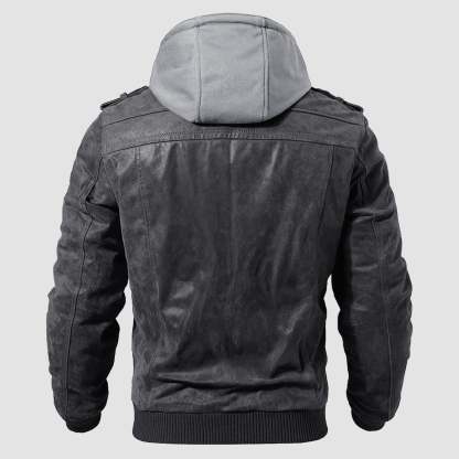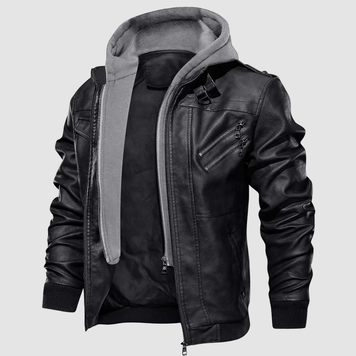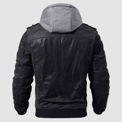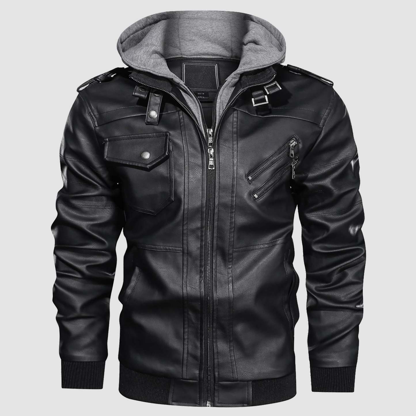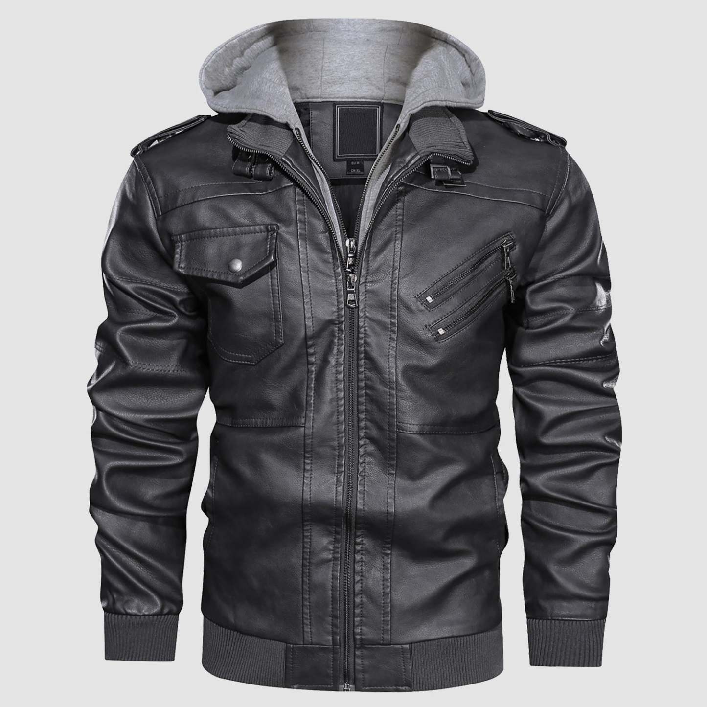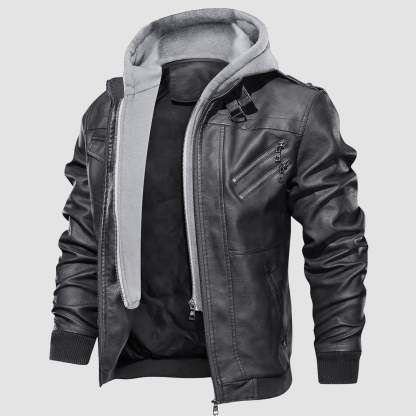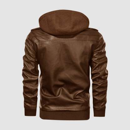 Men's PU Bomber Jacket Faux Leather Motorcycle Jaketc with Removable Hood