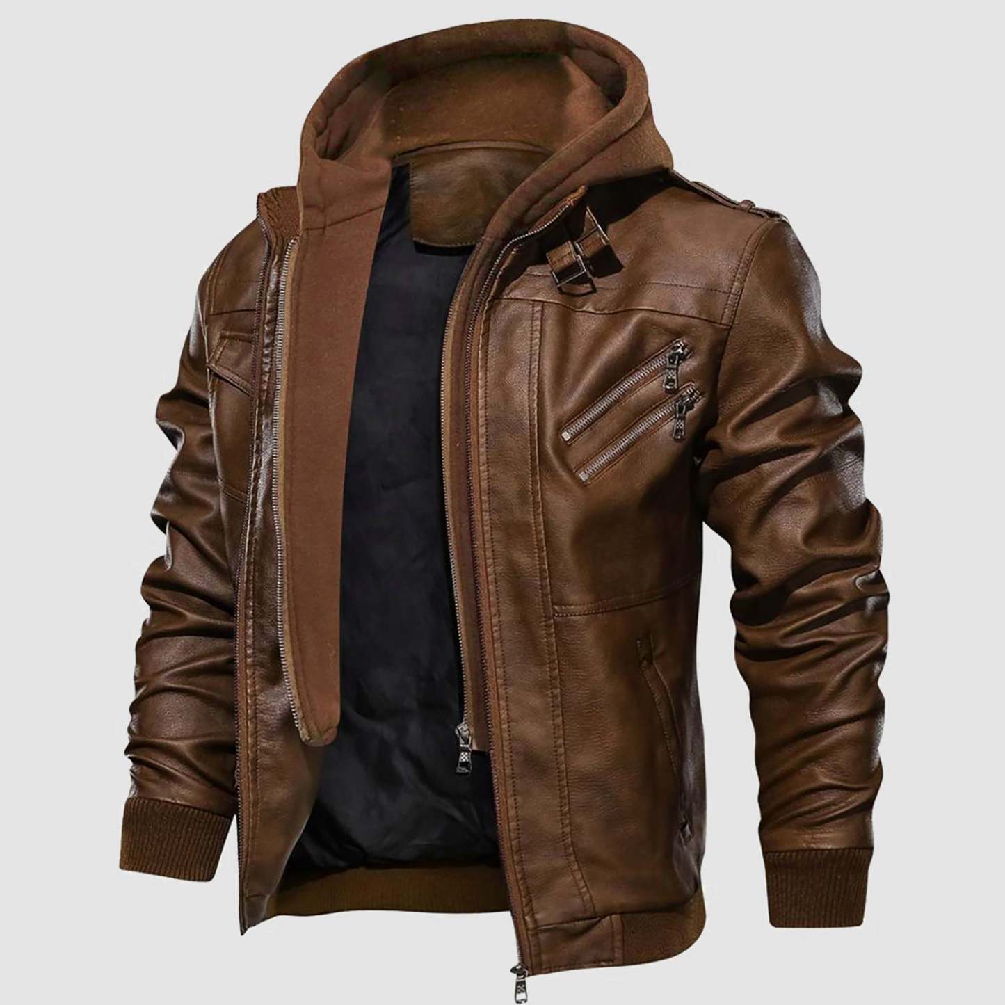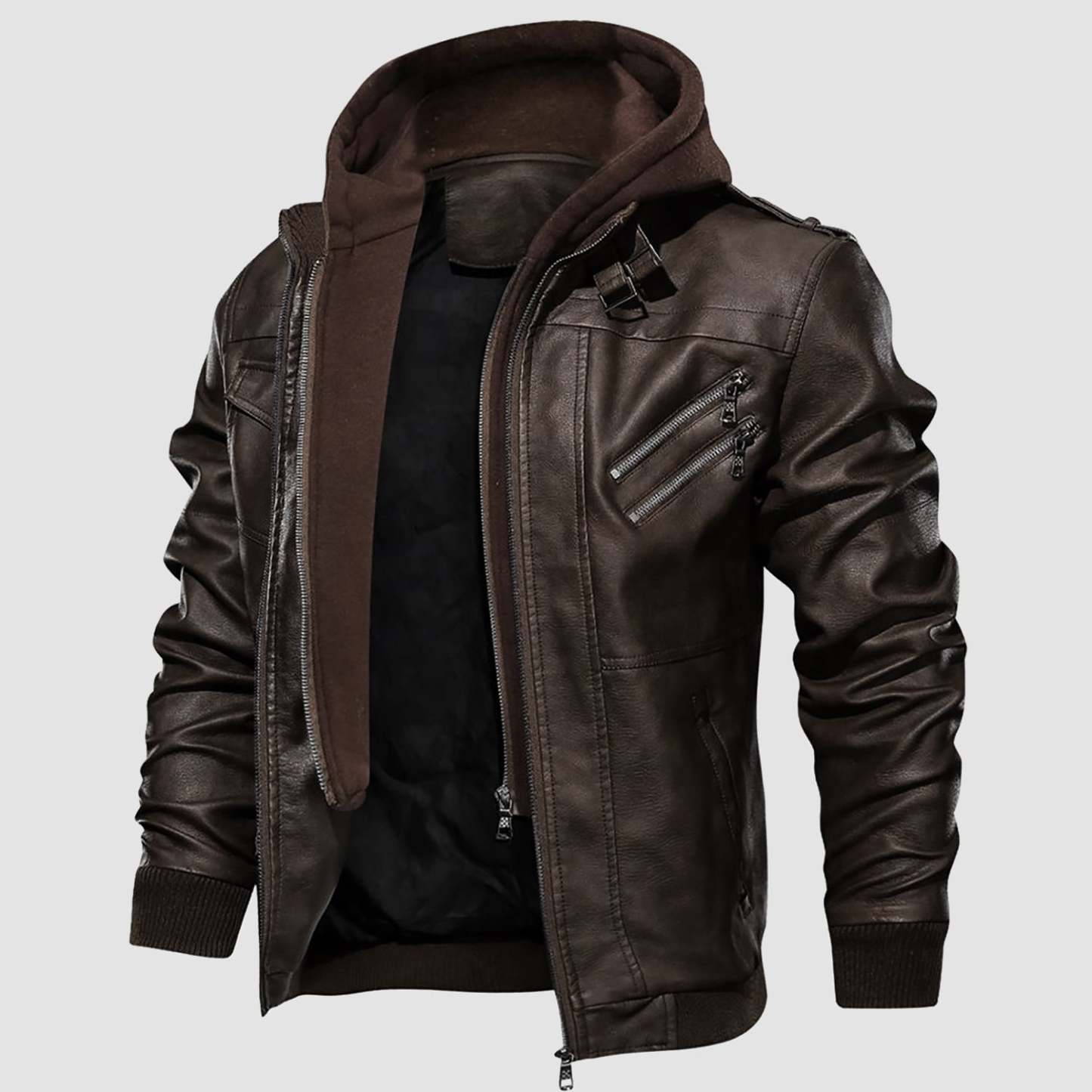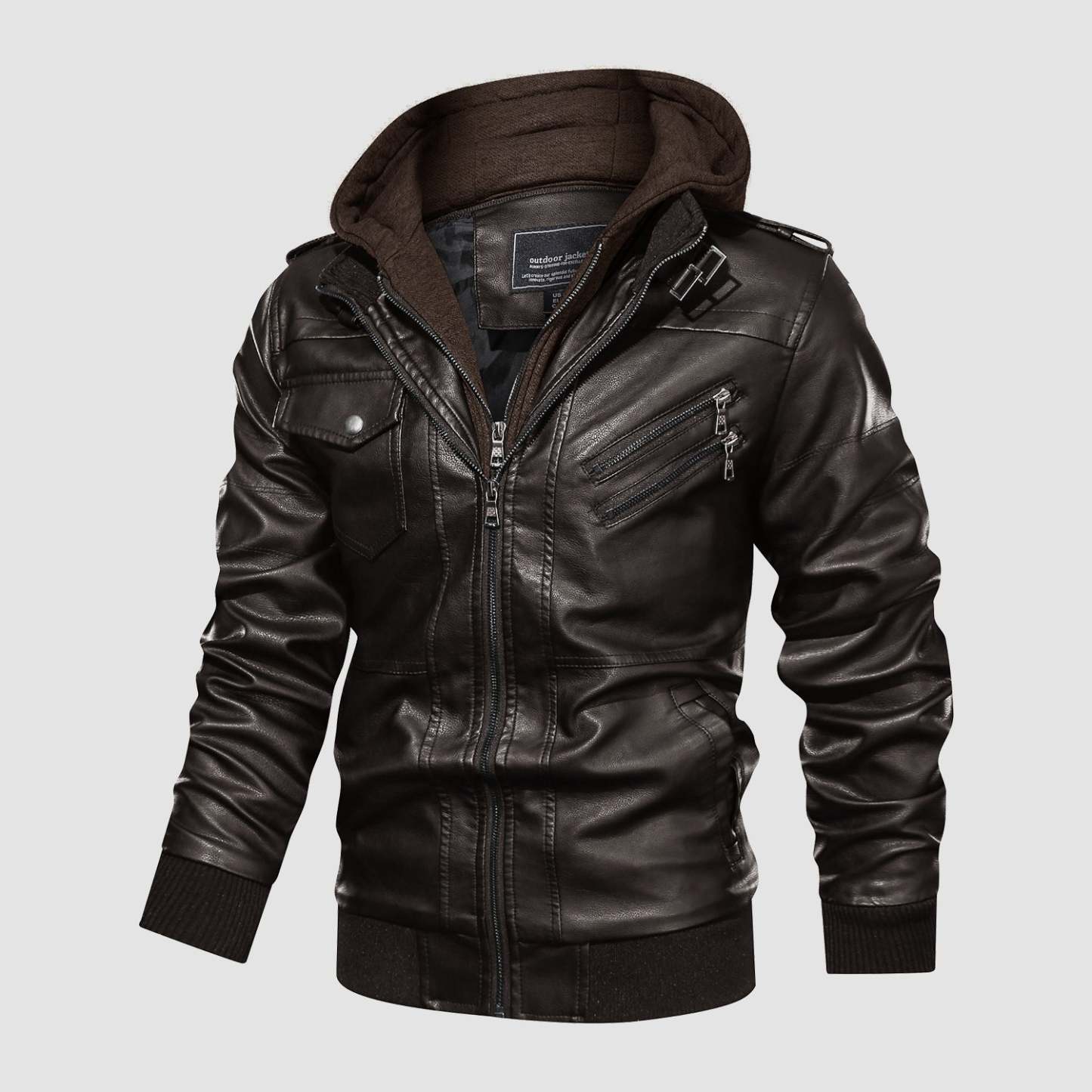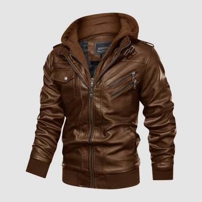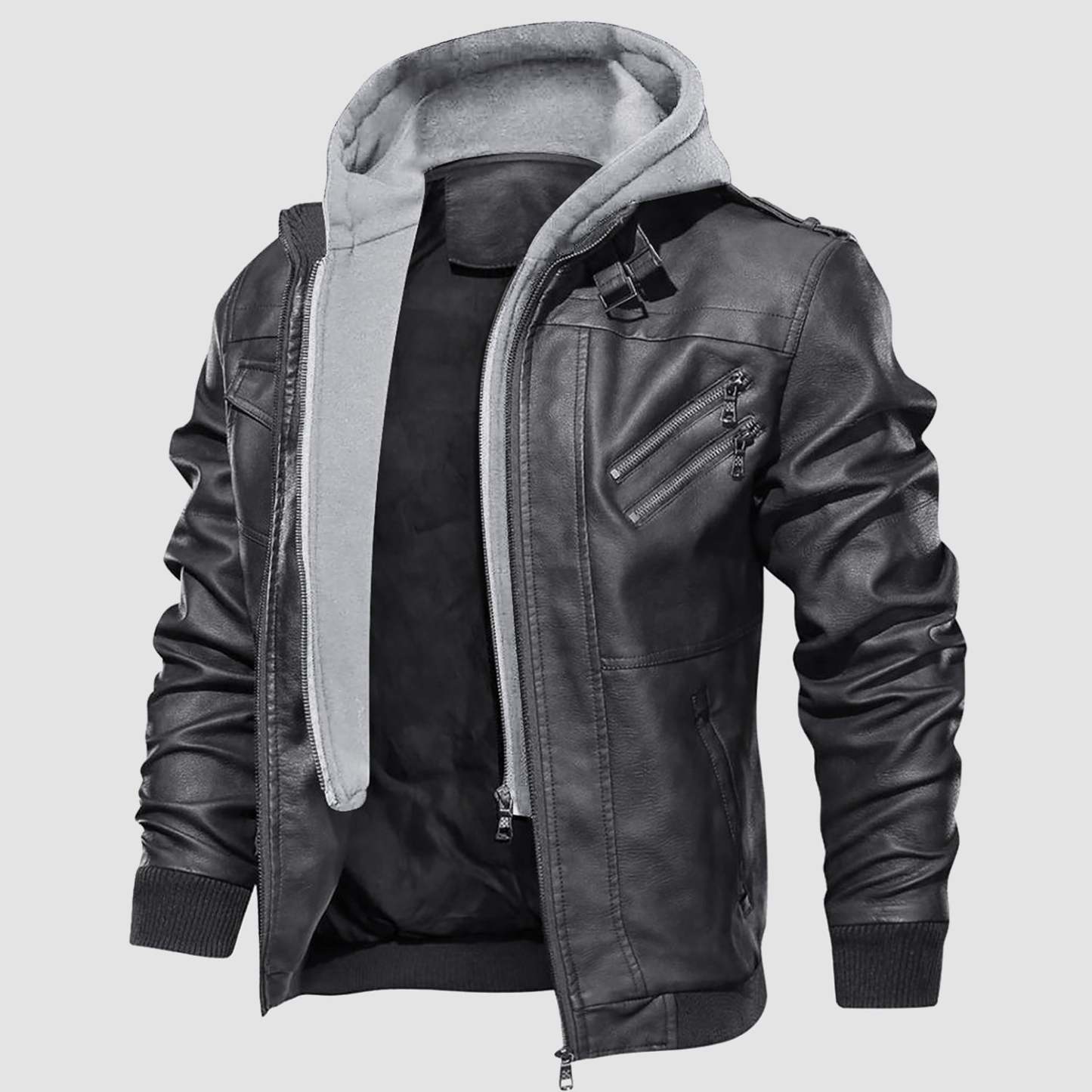 Men's PU Bomber Jacket Faux Leather Motorcycle Jaketc with Removable Hood