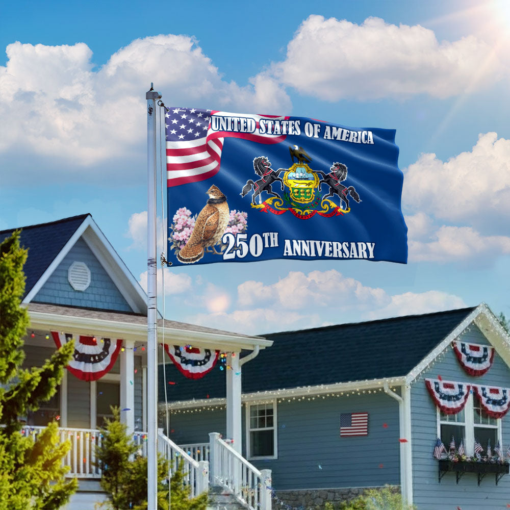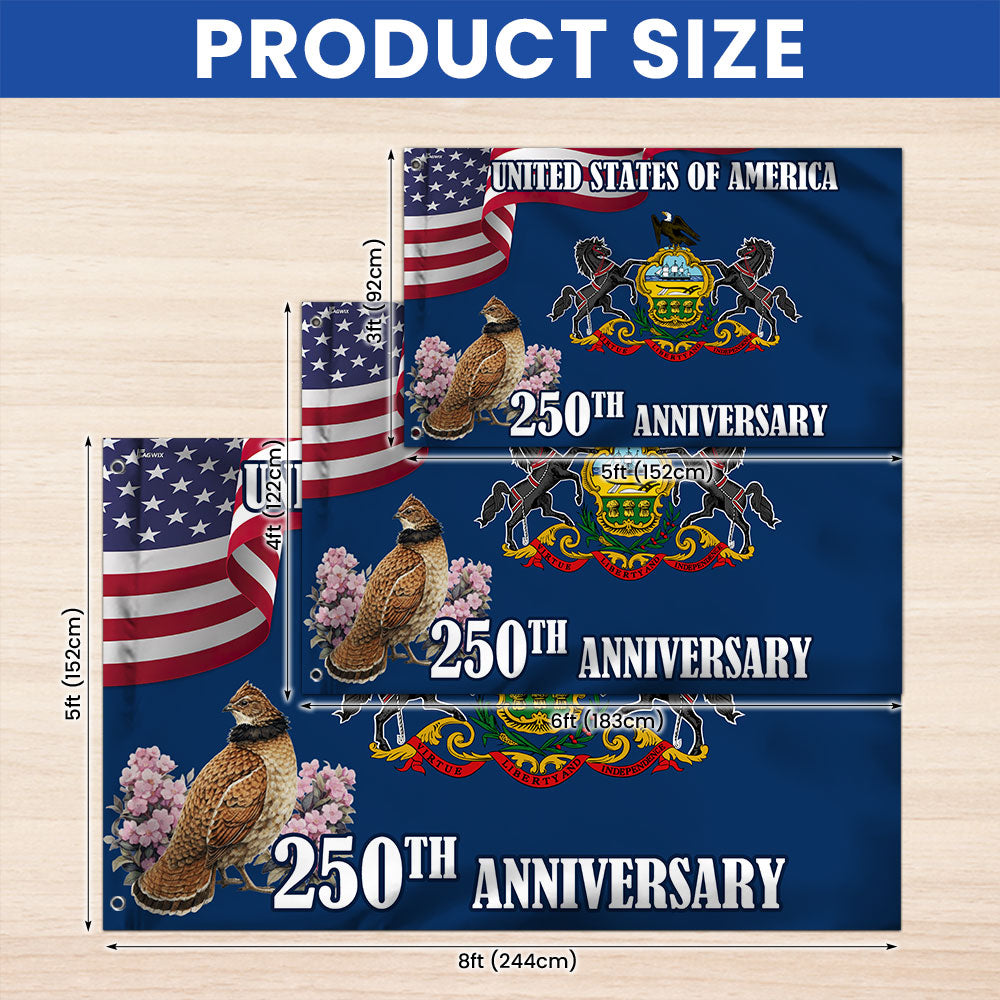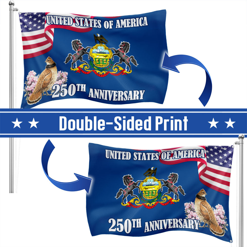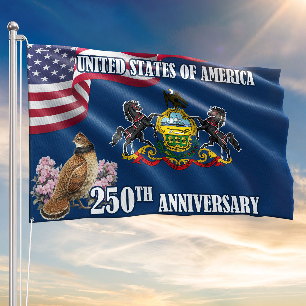 250th Anniversary Pennsylvania with Ruffed Grouse American Grommet Flag Are you looking for something to decorate your home more outstandingly or make a gift for your beloved? Our custom printed flags would be a wonderful choice for a home decor accessory or a perfect gift to give your families and friends.