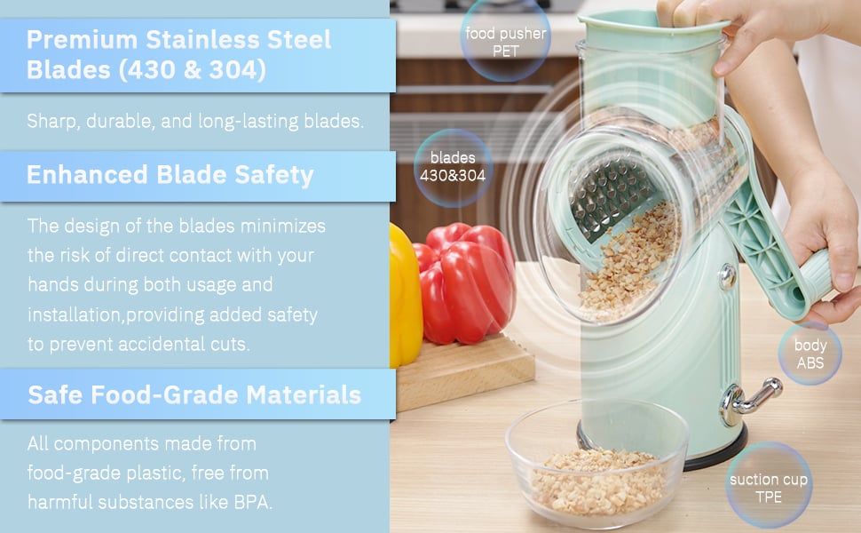 For material selection, the blades are made of high-quality 430 and 304 stainless steel, offering excellent durability and cutting performance, enabling efficient and convenient food processing. Other components are made of food-grade plastic that is free from harmful substances like BPA, ensuring safety. This careful choice of materials allows users to use the product with peace of mind, without worrying about food safety issues.