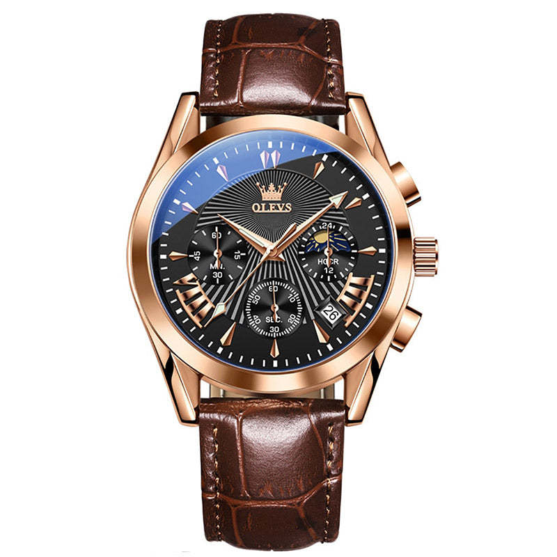 With its elegant leather strap, precise quartz movement, and a range of functional complications – chronograph, calendar function, luminous hands – it is ready for whatever everyday life brings. Yet it stands out with a single, special feature: the moon phase display. A window to the sky, framed in stainless steel and genuine leather.