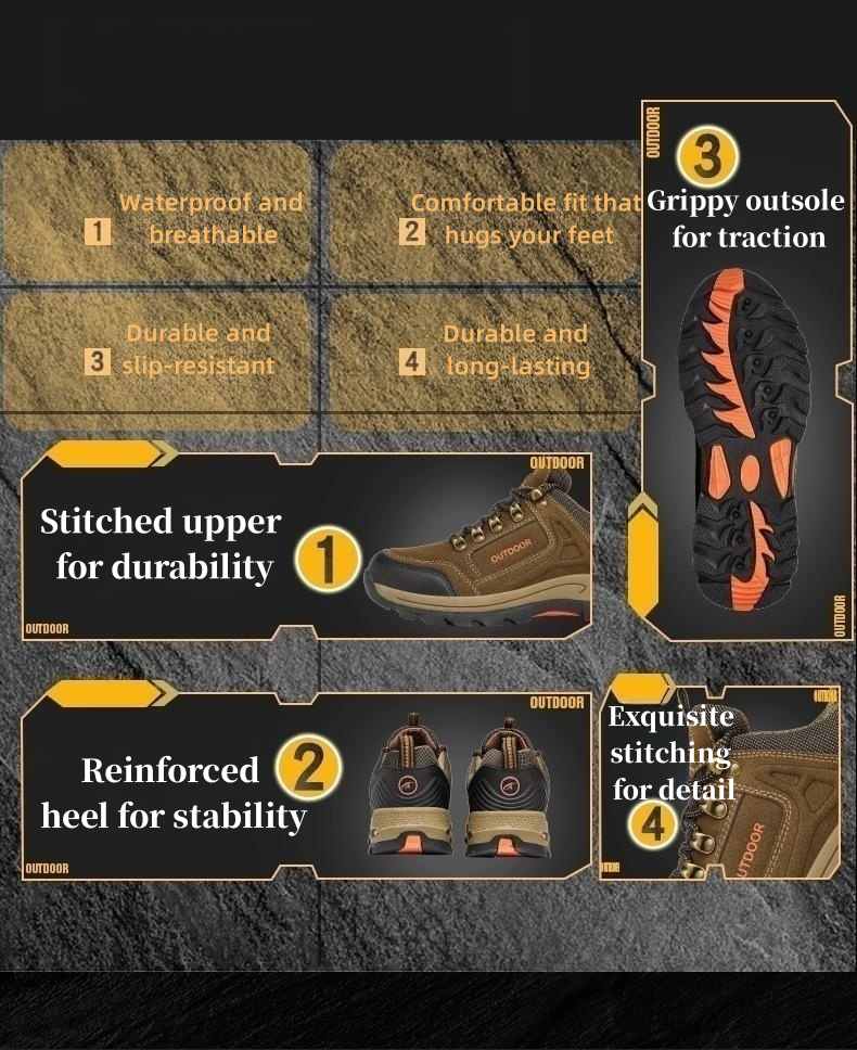 These shoes are made with excellent waterproof leather materials, providing outstanding waterproof functionality to keep your feet dry and comfortable even in harsh weather conditions by effectively preventing water penetration.