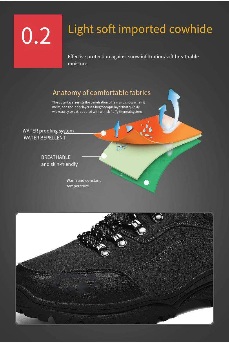 We prioritize comfort in our snow hiking boots by designing them with soft uppers and soles, offering excellent elasticity and flexibility. This allows you to move and climb more freely during outdoor activities.