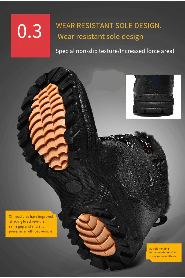 To ensure your safety on snow or icy surfaces, our snow hiking boots employ highly efficient anti-slip designs. The special sole material and pattern provide outstanding traction and stability, reducing the risk of slipping.