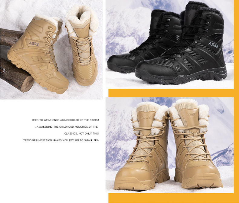 The upper of snow combat boots is made of waterproof leather, which is very scratch and abrasion resistant. The gusset tongue prevents pebbles, sand, dirt and other debris from entering these combat boots. The ergonomic design allows you to easily put your feet in these combat boots. Durable metal eyelets and laces open and close quickly. Excellent workmanship, the snow combat boots are very durable and high quality.