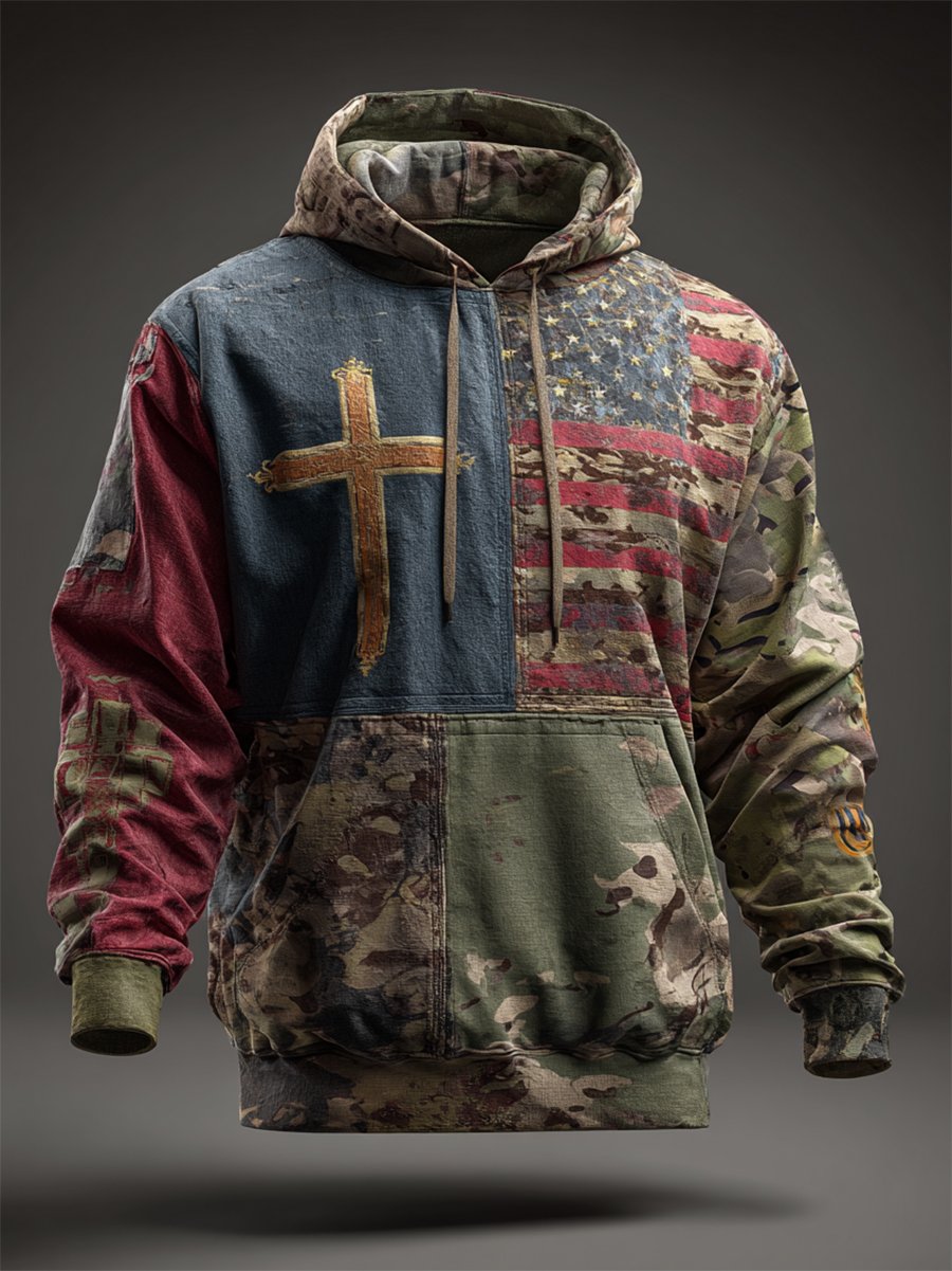 Men's Vintage Casual American Flag Cross Faith Hoodie