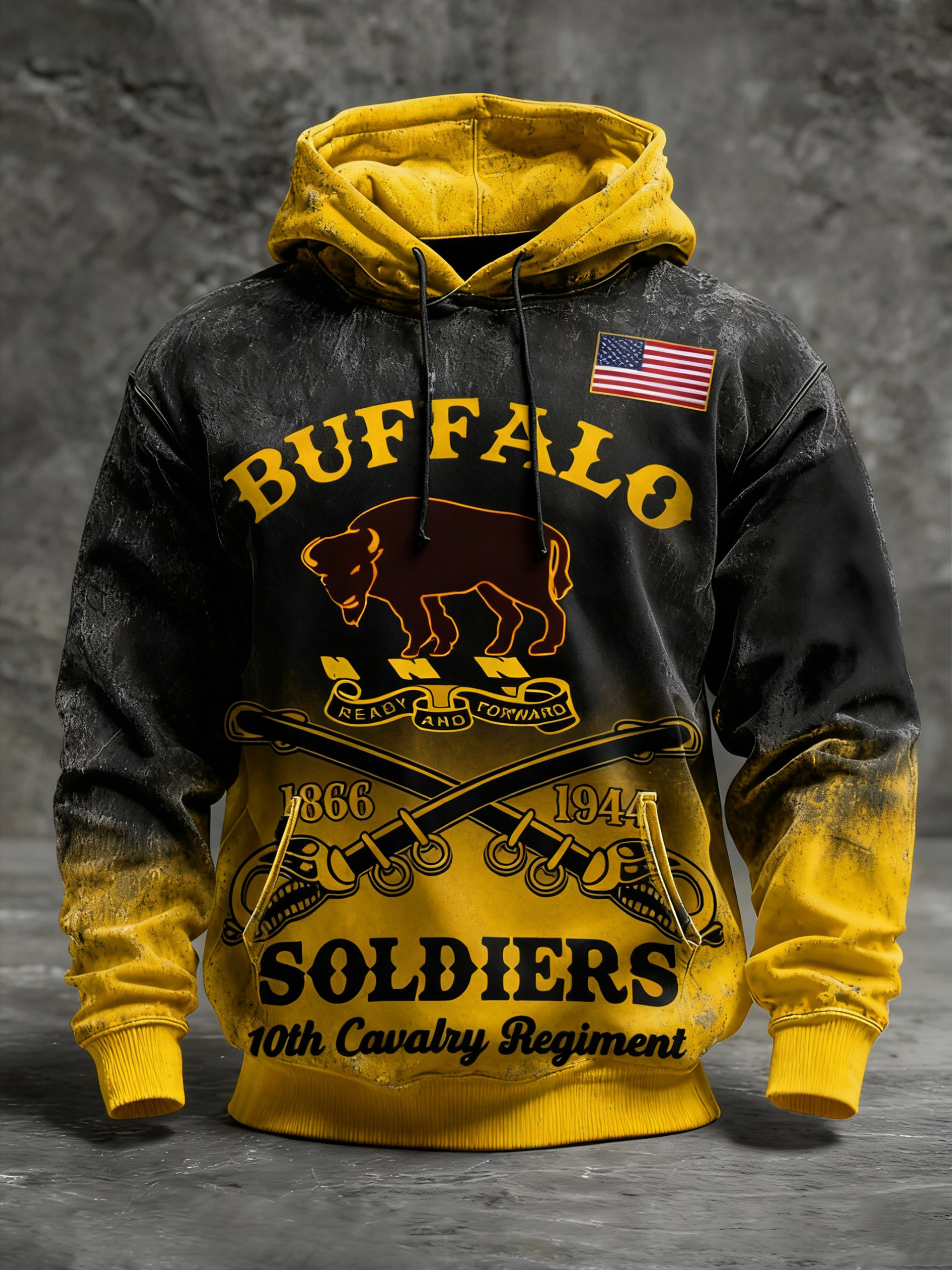 Men's Winter Retro Color Block Distressed Buffalo Soldier Print Hooded Top