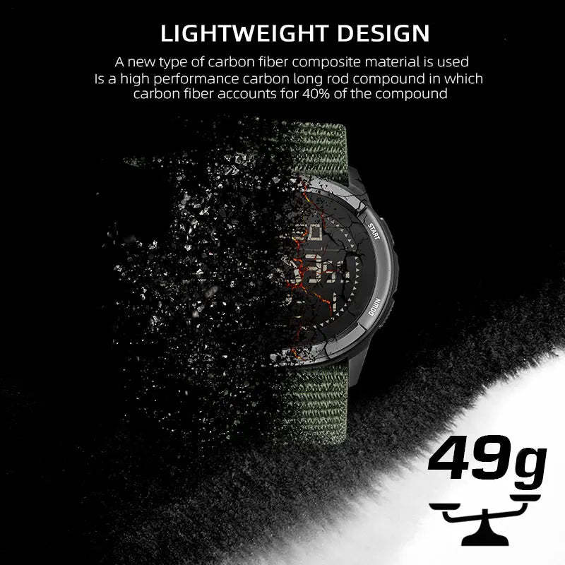 This military digital sports watch is designed for those who demand durability, precision and functionality. Made of super lightweight carbon fiber, it offers a comfortable yet sturdy fit, perfect for outdoor activities and sports. The integrated compass function ensures that you always stay on course during hikes, camping trips and tactical missions, while the shock-resistant design offers protection against heavy impacts. With a water resistant rating of up to 50 meters, this watch is resistant to rain, splashes and water activities, making it the ultimate companion for an active lifestyle.
