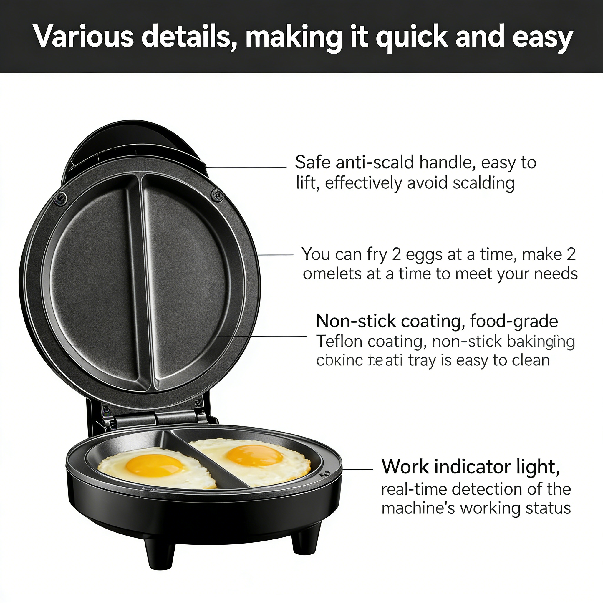 cook two eggs or omelettes at once with fast, even heating and no flipping needed. The smart temperature control and non-stick surface deliver perfect results without burning or mess ✨.