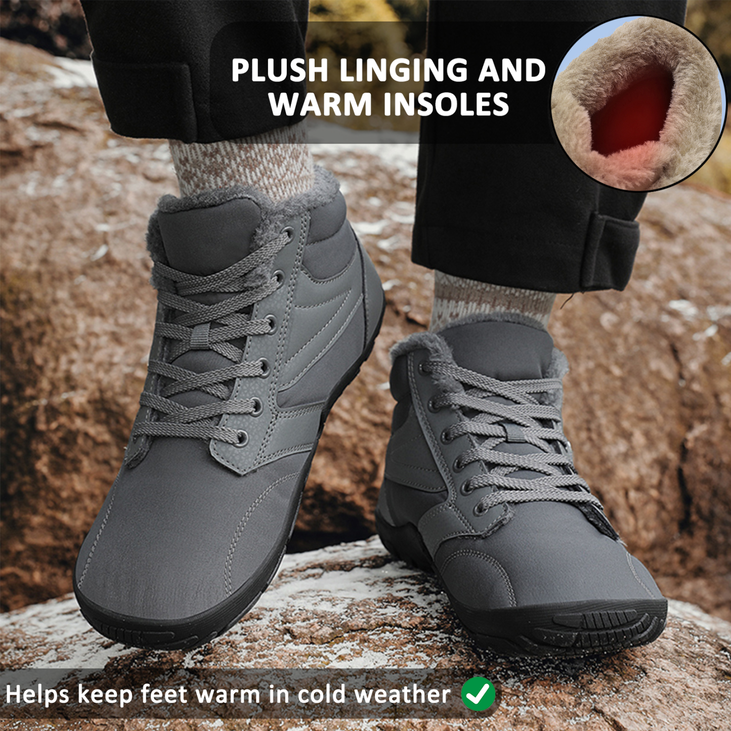 The specially designed barefoot inner design with a large toe box not only gives your foot the necessary space and perfectly adapts to the shape of your foot but also bids farewell to sore feet, ensuring your winter walks are pure comfort and joy.